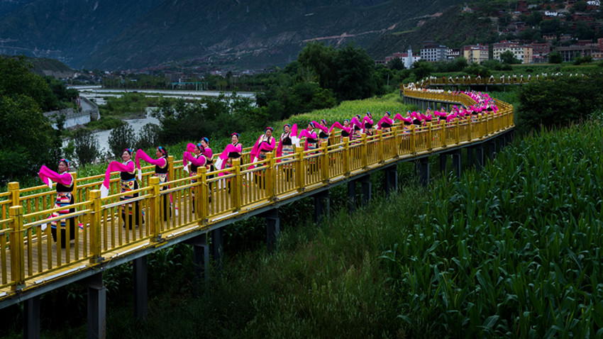 金弦子廣場,舞者們仿若守護者一般,圍著金黃色的弦子雕塑,或輕歌曼舞或昂揚踏步,斑斕的畢旺、搖曳的流蘇和飄逸的紅袖與花共舞,與景相映,聲聲吟唱、步步踏尋,是追憶更是誓言。