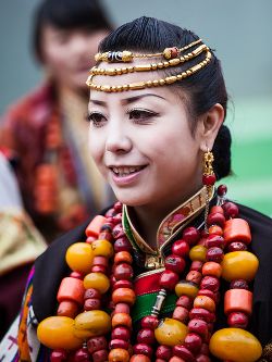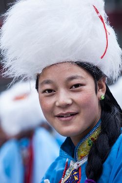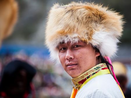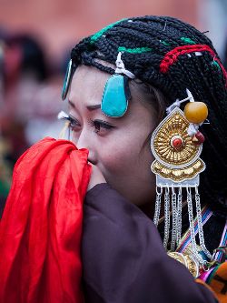 藏裝的基本特點是長袖、寬腰、大襟、肥大。直線寬邊,色彩對比強烈。男女藏袍均習慣以粗紡厚毛呢為料,左襟大,右襟小,一般在右腋下釘一個紐扣,或是用紅、藍、綠、雪青等色布做兩條飄帶,穿時結(jié)上。男式藏袍多為黑、白兩色,領圍、袖口、衣襟和底邊,鑲上色布或綢子底邊,古樸渾厚。夏天或勞動時,一般只穿左袖,右袖從后面拉到胸前搭在左肩上,也可左右袖均不穿,兩袖束在腰間,古銅色的皮膚袒露于外,雄風凜凜,彪悍剛健。女式藏袍,分有袖和無袖的兩種,夏秋兩季的藏袍無袖。里面多襯有紅、綠等色彩鮮艷的襯衣,襯衣翻領在外,衣袖要長于胳膊一至二倍,長出部分,平時卷起,舞蹈時放下,舒展飄逸,瀟灑自如。藏族的帽子式樣繁多,各地均有不同,拉薩等地以金寶頂帽為最多,用金絲或銀絲繡織圖案,在陽光照耀下,閃閃發(fā)光。金花帽是男女老幼都喜歡戴的民族帽。男女穿的藏靴,底高二寸,靴腰高至小腿以上,靴面用紅綠相間的毛呢裝飾,繡有圖案花紋。靴頭向上隆起。藏族男女喜歡佩飾。耳穿大環(huán),手腕金銀,頂戴珠鏈,尤其是在腰間,男挎長劍,女佩腰刀,更顯得粗獷彪美。