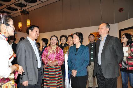 穆黎代表甘孜州婦聯(lián)向劉奇葆獻上藏繡哈達(dá)。