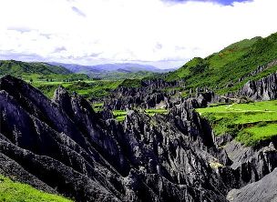 墨石公園,是中國唯一高原石林景觀,被譽(yù)為“中國最美景觀大道第八美 ”。受第四紀(jì)新構(gòu)造運(yùn)動(dòng)影響,隨著青藏高原的隆起,鮮水河斷裂帶中的巖石受到擠壓、剪切、破碎、糜化,形成糜棱巖石林。石林含丐鹽,受空氣濕度影響,干燥季節(jié)呈淺灰色、淺藍(lán)色,濕潤季節(jié)呈滄黑色,因此又稱之為變色石林。