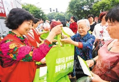 6月4日,江西省新余市渝水區(qū)城北街道辦的志愿者在恭惠農(nóng)貿(mào)市場(chǎng)門口向群眾免費(fèi)發(fā)放環(huán)保袋。周亮 攝