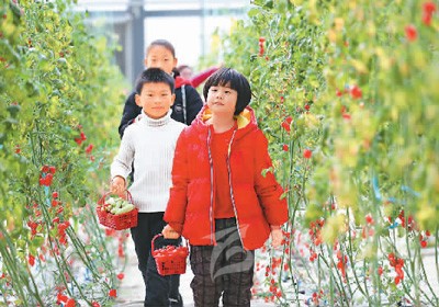 1月3日,浙江省湖州市德清縣洛舍鎮(zhèn)魚菜共生植物夢(mèng)工廠,游客正在采摘新鮮的小番茄。