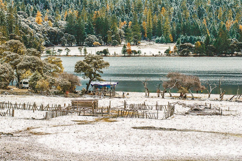 伍須海的色彩,四季都會(huì)變化,秋天最為精彩,滿湖的深綠,青黛的暗針葉林,金黃色的紅杉,火紅的槭樹,褐色的高山櫟,以及點(diǎn)綴于其間的沙棘果實(shí),都五彩繽紛地點(diǎn)染著這張“畫布”。