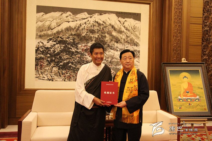 產(chǎn)業(yè)化發(fā)展的探索之路,不僅圓了年敘·多吉頓珠的“文化產(chǎn)業(yè)夢”,而且也讓他實(shí)現(xiàn)了一次華麗轉(zhuǎn)身,成為一名有擔(dān)當(dāng)?shù)钠髽I(yè)家。今年9月5日至15日,由中華文化發(fā)展促進(jìn)會、西藏自治區(qū)文化廳、西藏自治區(qū)文學(xué)藝術(shù)界聯(lián)合會、西藏自治區(qū)文化產(chǎn)業(yè)協(xié)會主辦,西藏崗地文化產(chǎn)業(yè)集團(tuán)、西藏拉姆拉綽唐卡畫院承辦的“西藏唐卡藝術(shù)——多吉頓珠、丁噶唐卡作品展“在北京中國國家博物館舉行。他和丁嘎先生現(xiàn)場向國家博物館捐贈了《釋迦牟尼》、《五方度母》、《綠度母》和《觀音》四幅精品,這是國家博物館首次收藏多派唐卡和嘎瑪嘎智畫派唐卡,填補(bǔ)了國家博物館館藏嘎瑪嘎止畫派和多派唐卡的空白。國家博物館館長呂章申先生熱情為兩位大師頒發(fā)了收藏證書并激動地說:“多吉頓珠先生和丁嘎先生捐贈的精品力作,豐富了中國國家博物館的館藏,更好地弘揚(yáng)了西藏文化藝術(shù)。國家博物館有責(zé)任把最好的藝術(shù)品收藏起來,留存于后世。”