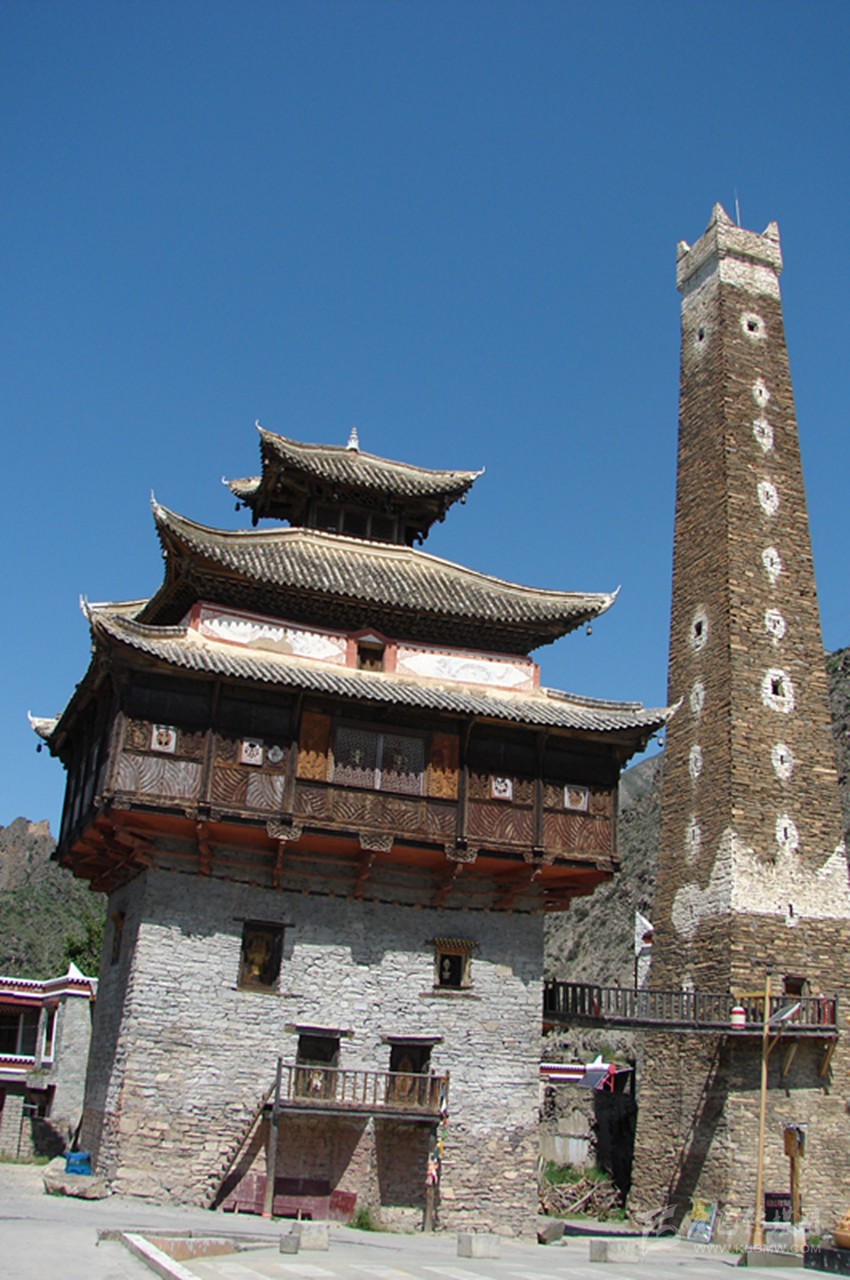 站在廣場中央仰望,碉樓有十五層高,約有二十余米,其外墻為片石壘砌,并附建有經(jīng)堂碉及過街樓,防御性極強(qiáng)。整座碉樓在修建中,層層收分,從墻面往上看,傾斜面在八十度左右。到達(dá)碉樓頂,面積只有四平米左右,在每一層樓里,都有外窄內(nèi)寬的窗戶,是典型的堡壘式射擊孔。在通往碉樓頂?shù)拿恳粚臃块g內(nèi),都有一根獨(dú)木梯連接著。第一層為石材壘筑的實心體,這種建筑方式為碉樓下大上小、重心向內(nèi)、穩(wěn)定性強(qiáng)的特點(diǎn)奠定了牢固的基礎(chǔ)。碉樓內(nèi),水源路網(wǎng)環(huán)環(huán)相通,倉儲空間很大。第二層為放置日常用品的地方,房門開在第三層,連接地面的依然是一根獨(dú)木梯,若遇敵人來犯時,人們便從獨(dú)木梯上攀援而上,再將獨(dú)木梯抽取。這樣,一座碉樓就固若金湯,只需從射擊孔中射出箭,或者從碉樓頂?shù)乃慕侨酉乱粔K塊巨石,不管敵人是如何的孔武有力,還是擁有如何的謀略,在碉樓面前都會束手無策,最后只能選取最原始的進(jìn)攻方法——圍而不攻。坐待碉樓里的人彈盡糧絕之日,不過,人們在修建碉樓時,已充分的考慮了這些因素,在每一層樓里都儲備了足夠幾年之需的食物和水,這樣,往往是圍攻的人耐不住性子,最后只好悻悻然退卻。