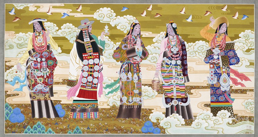 青藏高原有著曠遠(yuǎn)弘大的人文地理,有著神秘久遠(yuǎn)的宗教文化傳承,正是這蒼茫大地孕育了藏族人;正是這片極度追求審美體驗(yàn)并把生活高度藝術(shù)化的疆域,滋養(yǎng)了西藏藝術(shù)。從早期的巖畫、旗幡畫、唐卡、壁畫,再到當(dāng)代的丹青重彩,無(wú)不生發(fā)于這片神奇高原,皆是中華民族文化寶庫(kù)中燦爛的牟尼寶珠。唐卡繪畫肇啟于松贊干布隆興之時(shí),向南學(xué)習(xí)印度、尼泊爾布畫,往西受到犍陀羅藝術(shù)浸潤(rùn),向東融合唐、宋、明、清之審美,再集藏地宗教文化、民族審美熔為一爐,鑄就一千三百年唐卡繪畫之法脈。它不僅是獨(dú)具魅力的藏文化之血脈源流,更是各民族文化交融、和諧互生的典范,對(duì)世界藝術(shù)有著深遠(yuǎn)的影響。