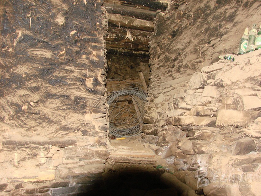 鍋莊房后,有兩道門,其中一間為放置糧食的庫(kù)房。而另一間房屋,門檻高于鍋莊房許多,需要跨上兩級(jí)臺(tái)階才能上去。門較矮小,打開(kāi)房門,一股潮濕的氣味撲鼻而來(lái),眼前一片漆黑,什么也看不見(jiàn)。我打開(kāi)隨聲攜帶的電筒,借助微弱的光線,勉強(qiáng)能看見(jiàn)房屋內(nèi)的擺設(shè)。房屋的右面角落里,有用木頭搭建起來(lái)的籠子,其高約一百三十厘米,寬約一百厘米。在房屋的左邊,有一曲折的甬道,也需要走上兩級(jí)臺(tái)階。牟大哥告訴我,這里是用來(lái)關(guān)押犯人的地方。