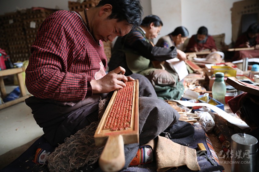 雕刻藝人正在刻經(jīng)版。