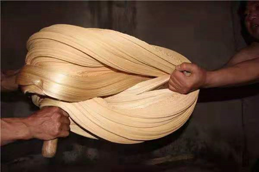 扯糖也是熬糖過程中十分關(guān)鍵的一個(gè)環(huán)節(jié)。剛出鍋的糖溫度可達(dá)兩三百度,徒手是不敢去觸碰的,扯糖需等到麻糖變得溫?zé)岵拍苓M(jìn)行,但又必須在它完全冷卻之前完成整個(gè)扯糖工序,否則等麻糖徹底冷卻就會(huì)變得僵硬無比。休息少頃,只見三叔熟練的用粘著面粉的手從盛放麻糖的簸箕中扯下三四斤左右的一團(tuán)麻糖,左手拿糖右手持杖(類似于搟面杖的木棍)作出扯糖的姿勢(shì),此時(shí)四叔拿著早已準(zhǔn)備好的沾了面粉的木棍將三叔的手中的麻糖攔腰別住,用力均勻的拉扯麻糖,三叔則在原地扎樁站穩(wěn),一手持杖作拉扯狀,一手微微扶住想要往下掉的糖尾,經(jīng)過幾次折疊和來回拉扯,麻糖變得均勻細(xì)長(zhǎng),兩人合力將扯好的麻糖平穩(wěn)的放在鋪有熟面粉的大簸箕中靜待冷卻。間隙二叔和父親又重復(fù)著扯糖的動(dòng)作,很快將一團(tuán)糖餅扯成糖帶。經(jīng)過拉扯后麻糖中間會(huì)形成很多的空洞,吃起來酥脆香甜。