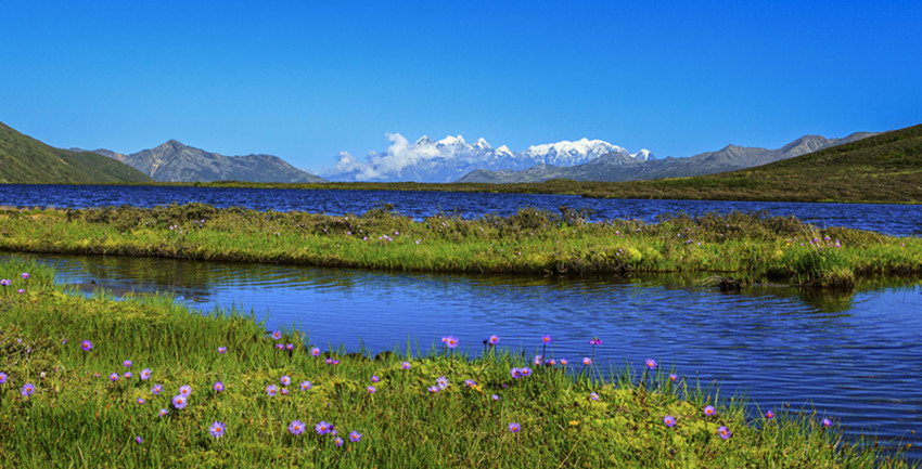 在山谷中穿行十余公里,路面一點(diǎn)點(diǎn)抬起,上了貢嘎山脈,徑直進(jìn)入康定情歌景區(qū)。隨著海拔的升高,涼意漸濃。山依舊是主角,地勢(shì)卻變得平緩而開(kāi)闊,有茵茵的草地,有大小湖泊,沿途山泉潺潺,野花點(diǎn)綴,空氣清幽,方才單調(diào)的褐色很快被淡忘。山體漸次出現(xiàn)密集而低矮的灌木,枝條筆直地立著,有高寒山區(qū)的凜然之氣。灌木一層層上延,樹木雜多,大片的原始森林漫過(guò)山體,將大山包裹起來(lái)。遠(yuǎn)處,藍(lán)天白云之下,貢嘎雪山在群峰中探出頭來(lái),擦亮高空的陽(yáng)光。澄明的空氣里,仿佛可以聽(tīng)見(jiàn)雪??┛┑匦?。剎那間,仿佛所有的大山,都開(kāi)始舒展筋骨。