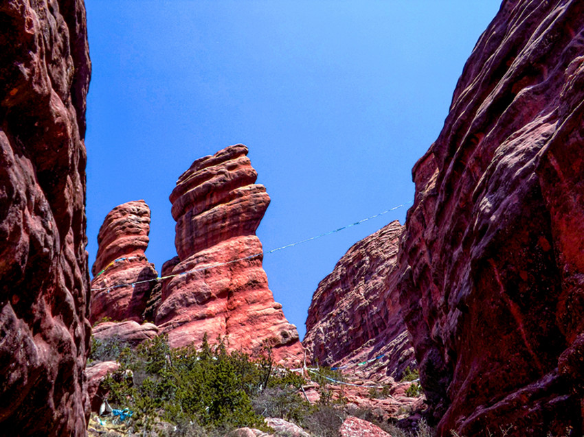 環(huán)顧四周,滿目怪石如林、變化萬(wàn)千的紅山地貌群,巨大形狀的,如城堡或紅色的塔樓,或雄偉壯觀拔地而起石墻,陡峭直立的錐形物,小型的栩栩如生似鳥獸或人,有的像觀音、佛塔、吉祥海螺、金剛杵,有不少像藏族民間常用泥捏成的祭祀、祈禱用的“察察”,奇石異峰精巧豐富,星羅棋布。