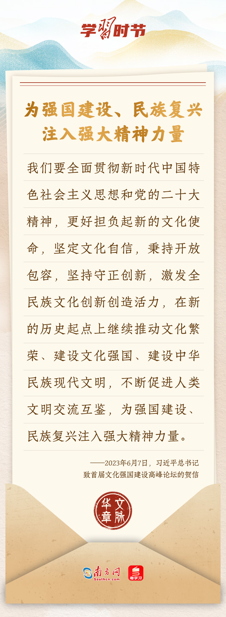 “中華民族在幾千年歷史中創(chuàng)造和延續(xù)的中華優(yōu)秀傳統(tǒng)文化,是中華民族的根和魂?!绷?xí)近平總書記多次通過發(fā)賀信、寫回信等方式,表達(dá)著對弘揚(yáng)中華優(yōu)秀傳統(tǒng)文化的殷切希望,飽含深情、字字暖心、催人奮進(jìn)。讓我們一起“讀”信。