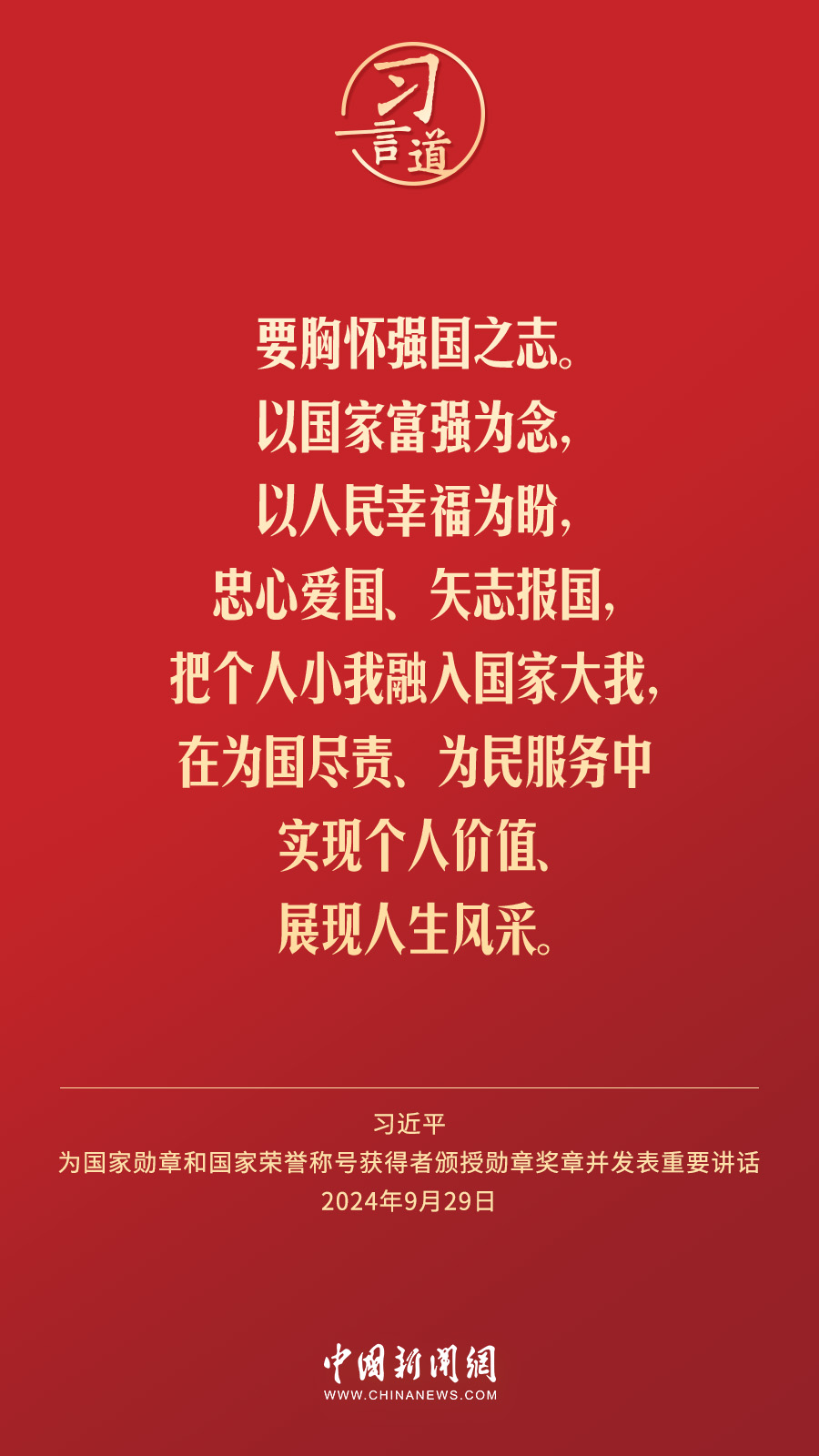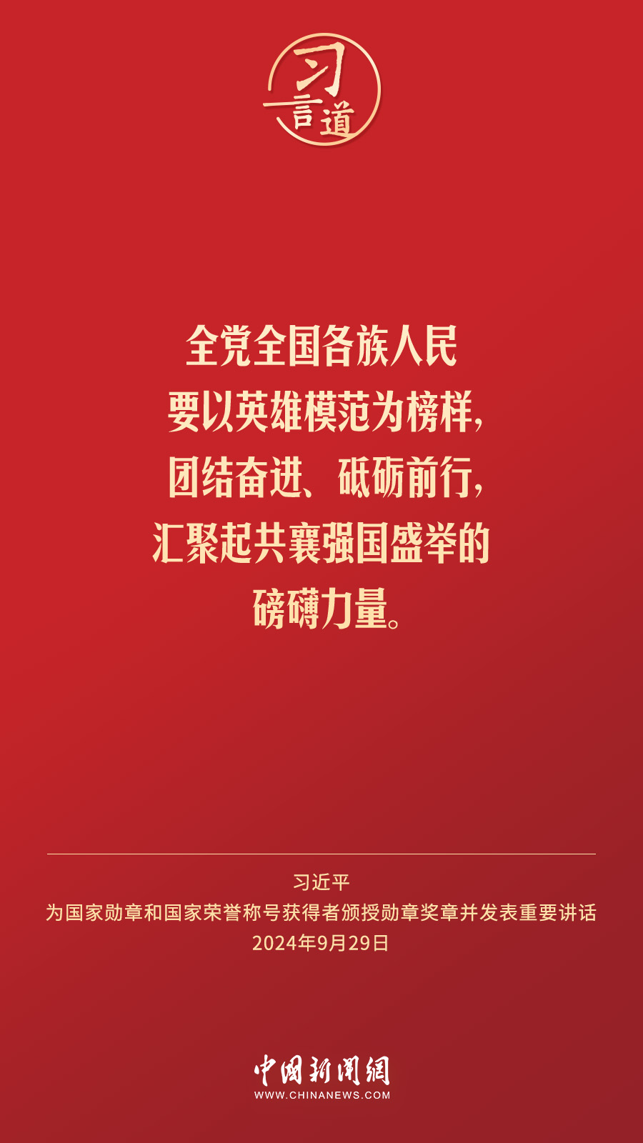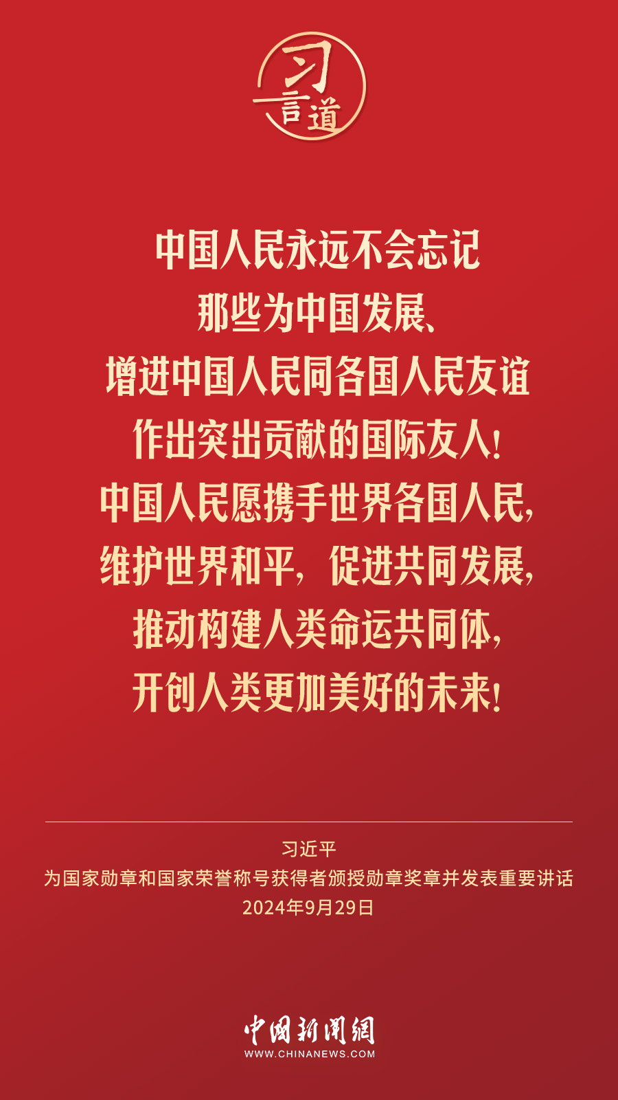 經(jīng)中共中央批準(zhǔn),中華人民共和國國家勛章和國家榮譽(yù)稱號頒授儀式于9月29日上午10時在人民大會堂隆重舉行。中共中央總書記、國家主席、中央軍委主席習(xí)近平向國家勛章和國家榮譽(yù)稱號獲得者分別授予“共和國勛章”“友誼勛章”和國家榮譽(yù)稱號獎?wù)虏l(fā)表重要講話。習(xí)近平指出——