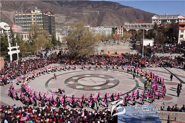 本網(wǎng)訊 (羅凌 志瑪 /文 王娟 多吉澤仁/圖)2月10日正值大年初三,高原江南巴塘陽(yáng)光燦爛,喜慶祥和。該縣夏邛鎮(zhèn)13個(gè)行政村組成8個(gè)表演隊(duì),1000余名農(nóng)民演員穿著節(jié)日的盛裝,到中山廣場(chǎng)參加“巴塘縣(夏邛鎮(zhèn))2016年迎新春暨藏歷火猴年原生態(tài)非遺文化展演”活動(dòng)。