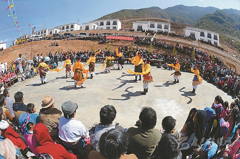 得榮縣將白松鄉(xiāng)同歸村納入生態(tài)移民搬遷工程,修建了14戶藏式新居。2016年3月,同歸村藏族群眾聚集在一起慶祝搬遷新居。 記者 李向雨 攝(資料圖片)