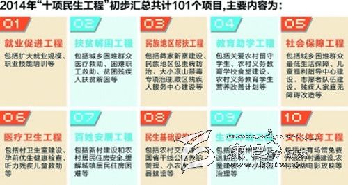 在征求各級部門、基層群眾意見的基礎(chǔ)上,今年“十項民生工程”已初步匯總101個項目,主要有:就業(yè)促進(jìn)工程,包括擴(kuò)大就業(yè)規(guī)模、職業(yè)技能培訓(xùn)等;扶貧解困工程,包括城鄉(xiāng)困難群眾醫(yī)療救助、困難職工救助等;民族地區(qū)幫扶工程,包括大小涼山禁毒專項治理、藏區(qū)殘疾人服務(wù)中心建設(shè)等;教育助學(xué)工程,包括農(nóng)村義務(wù)教育學(xué)校食堂建設(shè)等;社會保障工程,包括志愿者隊伍建設(shè)、殘疾人家庭無障礙改造等;醫(yī)療衛(wèi)生工程,包括孕前優(yōu)生健康檢查、聽力殘疾兒童救助等;百姓安居工程,包括農(nóng)村居民住房安全、緩解城鎮(zhèn)居民住房困難等;民生基礎(chǔ)設(shè)施工程,包括國省干線公路養(yǎng)護(hù)管理等;生態(tài)環(huán)境工程,包括耕地質(zhì)量建設(shè)、中小河流治理等;文化體育工程,包括體育場館免費開放等。