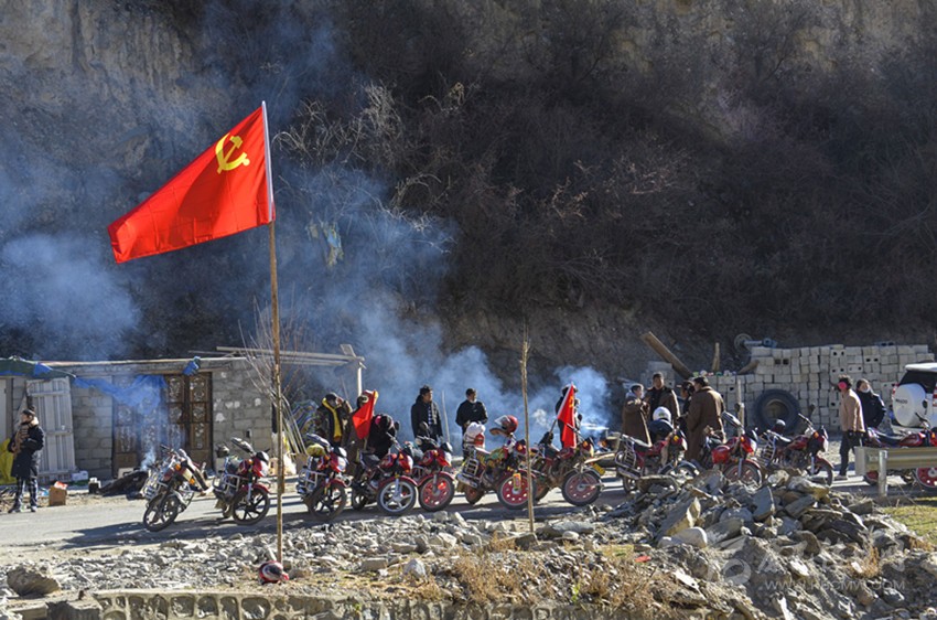 白玉縣山巖鄉(xiāng)摩托車隊以黨旗為引領(lǐng),及時支援受災(zāi)害威脅的村民。 本網(wǎng)資料圖