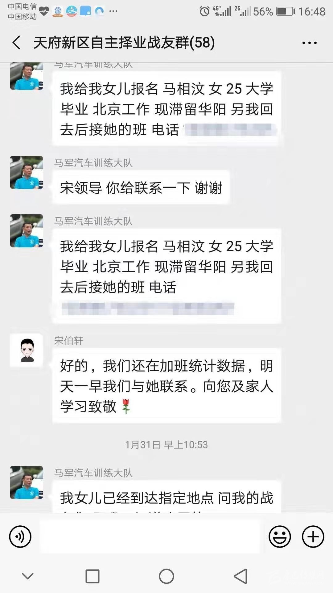 “我給我女兒報名,馬相汶,女,25歲,大學畢業(yè),北京工作,現(xiàn)滯留成都,另我回去后接她的班。”近日,一條微信截圖傳遍了天府新區(qū)退役軍人的朋友圈。