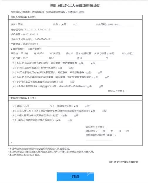 (二)服務內容。居住地醫(yī)療衛(wèi)生機構對申報人在開展流行病學史調查、測量體溫的基礎上,為符合條件的申報人出具《四川外出人員健康申報證明》。