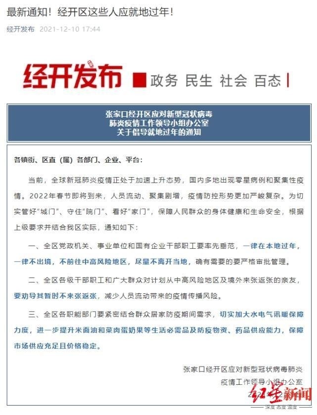 12月9日,河北張家口經(jīng)開(kāi)區(qū)也發(fā)出通知:全區(qū)黨政機(jī)關(guān)職工等就地過(guò)年。通知中倡導(dǎo):全區(qū)黨政機(jī)關(guān)、事業(yè)單位和國(guó)有企業(yè)干部職工要率先垂范,一律在本地過(guò)年,一律不出境,不前往中高風(fēng)險(xiǎn)地區(qū),盡量不離開(kāi)當(dāng)?shù)兀_有需要的要嚴(yán)格審批管理。