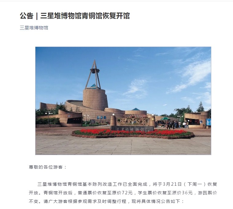 三星堆博物館青銅館基本陳列改造工作已全面完成,將于3月21日(下周一)恢復(fù)開放。青銅館開放后,普通票價(jià)恢復(fù)至原價(jià)72元,學(xué)生票價(jià)恢復(fù)至原價(jià)36元,游園票價(jià)不變。請(qǐng)廣大游客根據(jù)參觀需求及時(shí)調(diào)整行程,現(xiàn)將具體情況公告如下: