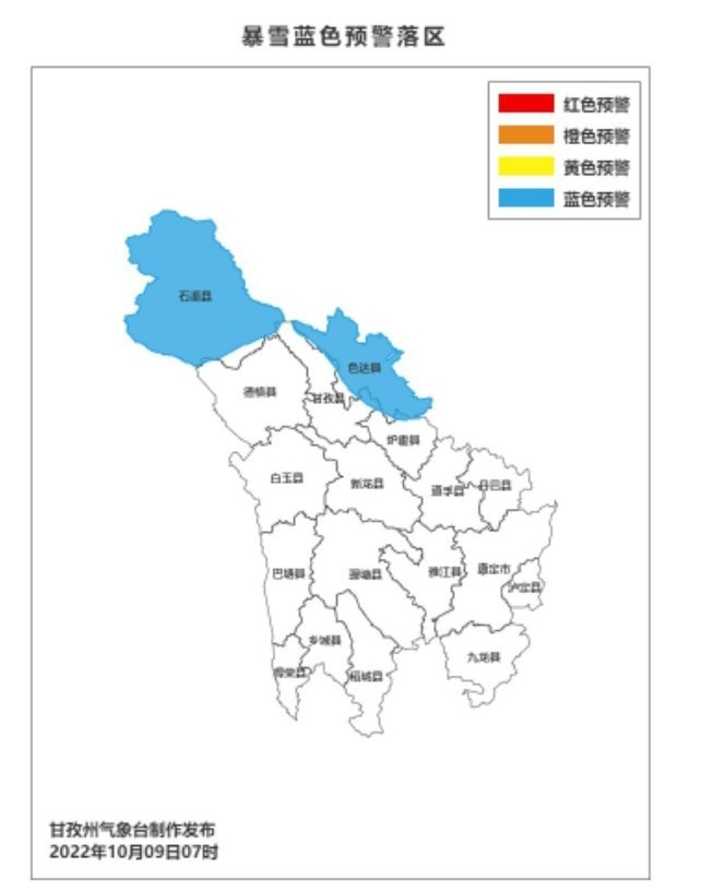 10月9日上午,甘孜州氣象臺發(fā)布了今年第一個暴雪藍色預警: