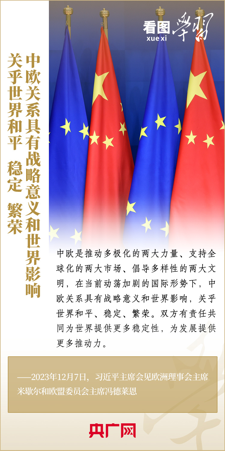 12月7日,國(guó)家主席習(xí)近平會(huì)見(jiàn)來(lái)華舉行第二十四次中國(guó)—?dú)W盟領(lǐng)導(dǎo)人會(huì)晤的歐洲理事會(huì)主席米歇爾和歐盟委員會(huì)主席馮德萊恩,雙方就事關(guān)中歐關(guān)系的戰(zhàn)略性問(wèn)題,以及中歐各領(lǐng)域?qū)υ捄献?、雙方重點(diǎn)關(guān)切、全球治理、國(guó)際和地區(qū)熱點(diǎn)問(wèn)題等深入坦誠(chéng)交換看法,并就一系列問(wèn)題達(dá)成重要共識(shí)。今年是中歐建立全面戰(zhàn)略伙伴關(guān)系20周年,習(xí)主席強(qiáng)調(diào),中歐關(guān)系具有戰(zhàn)略意義和世界影響,關(guān)乎世界和平、穩(wěn)定、繁榮。一起來(lái)學(xué)習(xí)!