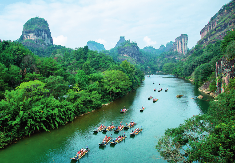 ??游客在福建省武夷山國家公園九曲溪乘船游覽(2023年10月3日攝)。陳穎攝/本刊