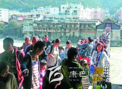 據(jù)縣文物局局長(zhǎng)郭成燕介紹,今年“十一”黃金周期間,游覽瀘定橋的游客較往年更理性,沒(méi)有出現(xiàn)井噴現(xiàn)象,每天游客量比較平穩(wěn)。游客主要以成都和重慶方向?yàn)橹鳎?5%以上的游客選擇自駕游出行。據(jù)悉,在10月2日這天,瀘定橋全天接待游客近萬(wàn)人。為了確保游客安全,縣旅游部門(mén)在橋頭設(shè)立了安全警示牌,在游客高峰期,工作人員每5至10分鐘分批次放行,每次參觀(guān)放行不超過(guò)100人,并安排工作人員在瀘定橋中央疏導(dǎo)游客,確保游人安全。同時(shí),在瀘定橋頭滾動(dòng)播出參觀(guān)須知和瀘定橋介紹,引導(dǎo)游人參觀(guān)。黃金周期間,該縣旅游部門(mén)堅(jiān)持24小時(shí)值班,隨時(shí)對(duì)瀘定橋及周邊進(jìn)行安全巡查,確保安全。截至10月4日,參觀(guān)瀘定橋的游客約3.3萬(wàn)人,門(mén)票收入達(dá)25萬(wàn)多元。