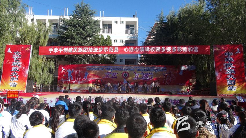 “手牽手創(chuàng)建民族團結(jié)進步示范縣·心連心演繹校園多姿多彩新和諧”被確定為本次活動的主題。輕快的音樂,靈動的舞步,具有濃郁藏民族特色的《炫舞鍋莊》拉開文藝表演的帷幕。表演者穿戴藏族服飾載歌載舞,盡情表演,瞬時將氣氛推向了高潮。文藝表演以學生的班級和教師的教研組為單位,將各自班級或教研特色融入到表演中,特別是一曲《做不到》,兩名男女中學生將學生時期的叛逆思想和對未來美好生活的向往展現(xiàn)得淋漓盡致。大合唱《我相信》,盡現(xiàn)了全班同學的團隊精神。同學們個個精神抖擻、氣勢如虹,唱出了對未來的無限希翼。表演持續(xù)2個多小時,教師和學生們將他們精心編排、傾情演繹的一個個精彩節(jié)目呈現(xiàn)給現(xiàn)場觀眾。
