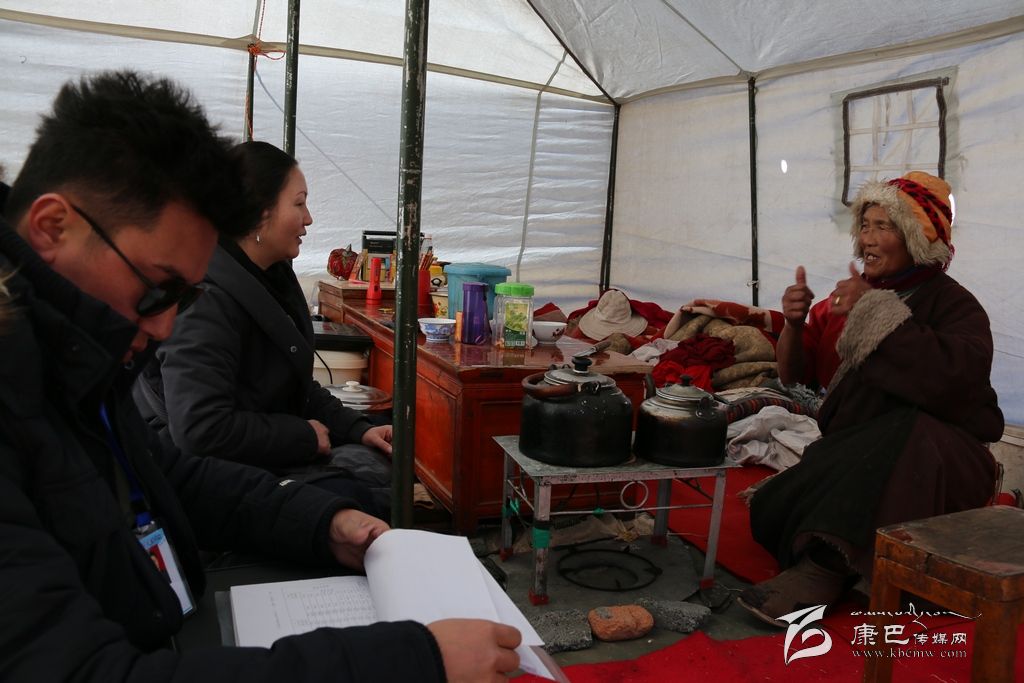 由于地震房屋不同程度損毀,70歲的降措和妻子其米拉姆住進了臨時帳篷里。李萍和同事為其米拉姆帶來了干糧,詳細詢問老人家的身體狀況,囑咐兩位老人注意身體。由于家里有50頭牦牛要放養(yǎng),老人的兒子和兒媳常年在牧場,家里只有兩位老人,李萍掏心的話讓其米拉姆老人十分感動,不停地說著感謝的話,眼睛里盛滿了淚水。老人說李萍就像自己的女兒一樣。
