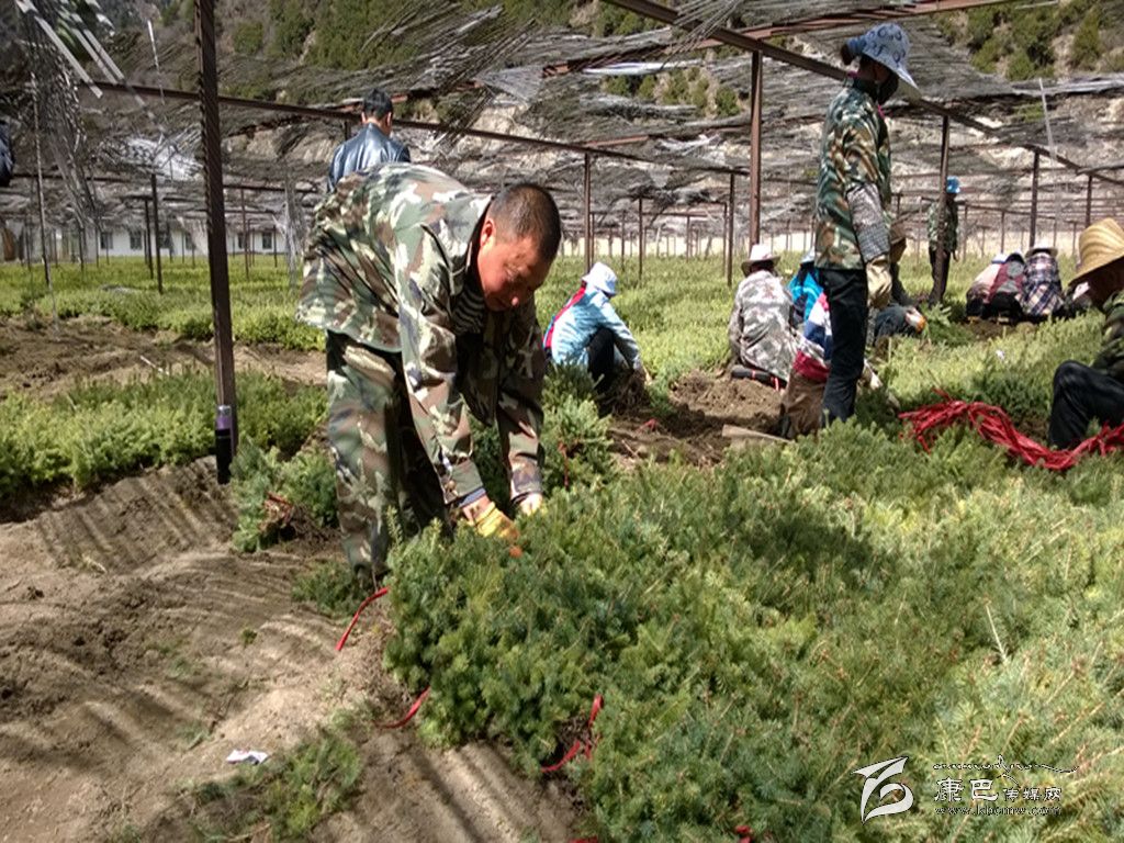 吳林與同事們?cè)诹謭?chǎng)培植樹苗。