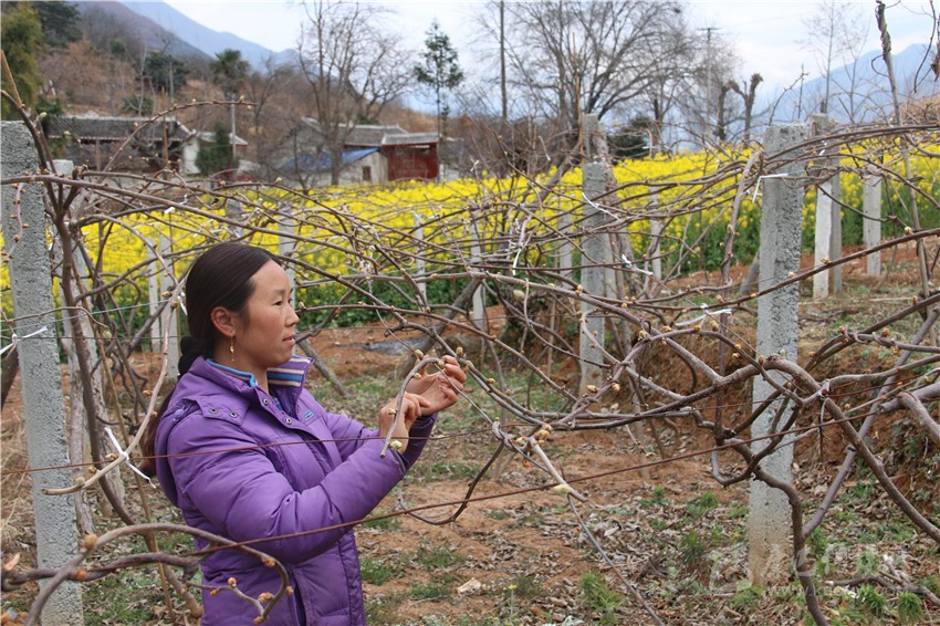 德威鄉(xiāng)海子村村民為紅心獼猴桃搭支架。