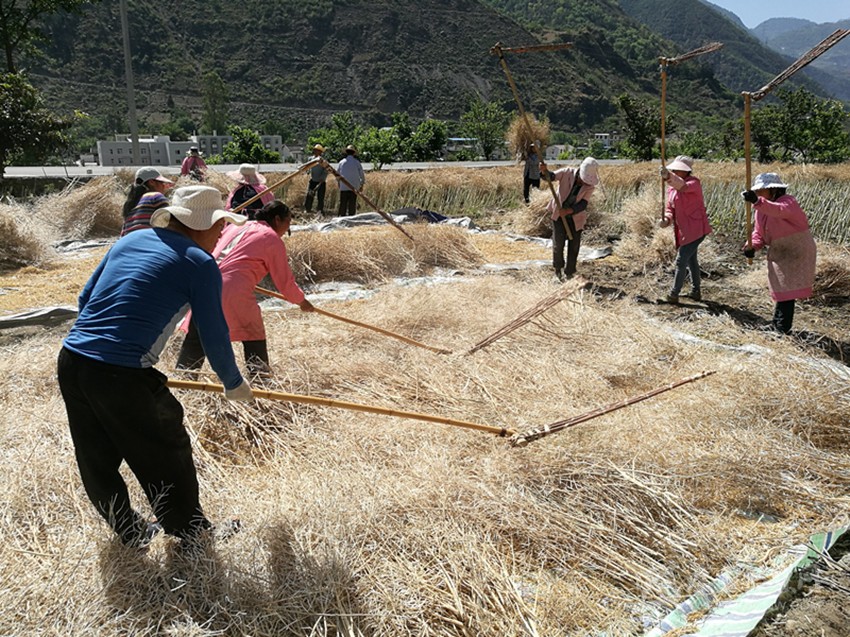 本網(wǎng)訊(尼胡克布 李娟 文/圖)5月12日,在瀘定縣德威鄉(xiāng)下河壩村農(nóng)田里,村民李永強正組織親戚朋友20余人,對自家3畝多油菜進行搶收。村民們有的負責把一捆捆曬干的油菜抱到油布上,有的負責用農(nóng)具進行打籽,現(xiàn)場一派繁忙的景象。
