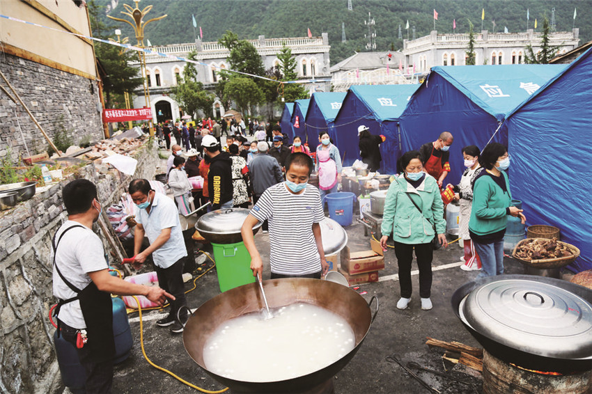 這是來之不易的“百家飯”,在“9·5”瀘定縣6.8級地震發(fā)生后,受災(zāi)村民你拿一袋米、我提一筐菜,你出一份力、我捐一點(diǎn)錢,齊心協(xié)力、共渡難關(guān),520人共煮一鍋“團(tuán)結(jié)飯”。