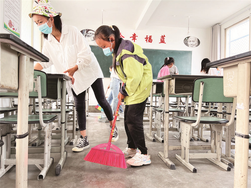 在學(xué)校一樓走廊,記者看到墻壁上貼滿了孩子們自制的民族團結(jié)手抄報和五十六個民族一家親的畫作。瀘定橋小學(xué)副校長杜德琴告訴記者,這是學(xué)校開展鑄牢中華民族共同體意識主題教育實踐活動的內(nèi)容之一?!斑@些都是老師、家長和學(xué)生一起完成的,‘團結(jié)’與‘奮進’已深深印刻在瀘定橋小學(xué)每一個人的言行中,我們是愛的傳遞者,我們是在以實際行動踐行校訓(xùn)。我希望災(zāi)區(qū)的孩子們能盡快走進學(xué)校,繼續(xù)學(xué)業(yè)?!?/p>