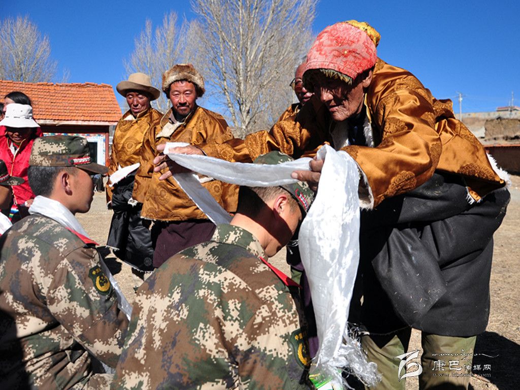 春節(jié)期間,理塘縣敬老院老人為前來慰問的官兵獻(xiàn)哈達(dá)。