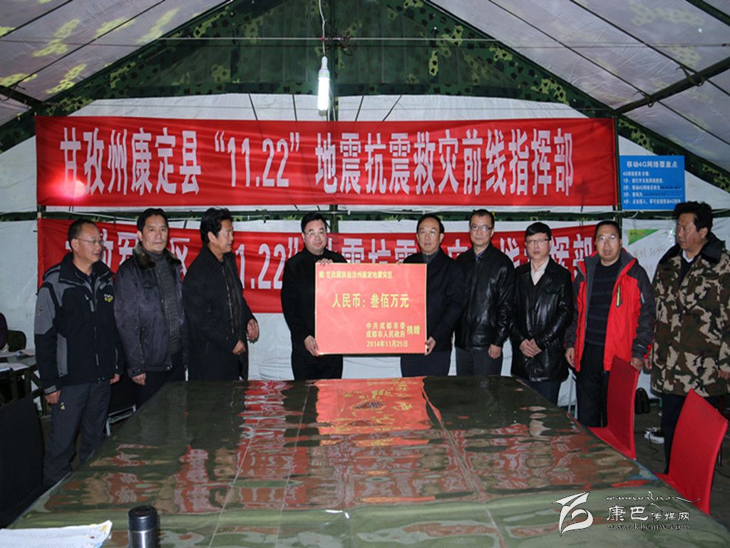 州委書記胡昌升接受成都市向康定縣“11·22”地震災(zāi)區(qū)捐款。