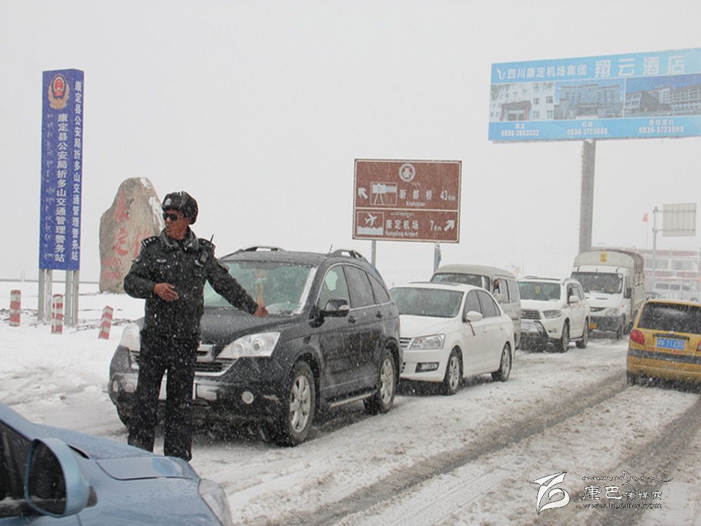 去年10月3日,華西都市報(bào)收到了讀者傳來的一張圖片,照片上的交警穿著厚厚的大衣,背景白雪皚皚。“這是我今天翻折多山的時(shí)候照的,當(dāng)時(shí)車子排隊(duì)翻山遇到堵車心里覺得毛焦火辣的,我當(dāng)時(shí)看到他站在暴雪中指揮交通,心里就像吃了定心丸,我要為這個(gè)交警點(diǎn)贊。”華西都市報(bào)記者尋著這條線索多方打探,終于聯(lián)系到了康定縣公安局交警大隊(duì)新都橋中隊(duì)長(zhǎng)王洛讓。