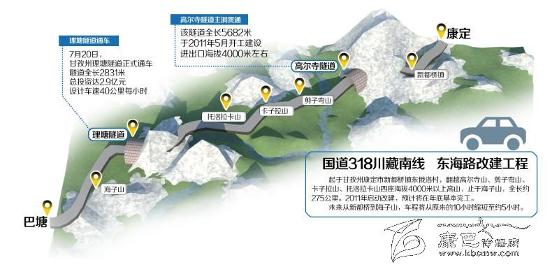國道318川藏南線是四川進藏大通道之一,也是甘孜藏族自治州境內極其重要的交通主干道之一。2011年啟動建設的東海路改建工程,按三級公路標準改建,起于甘孜州康定市新都橋鎮(zhèn)東俄洛村,翻越高爾寺山、剪子彎山、卡子拉山、托洛拉卡山四座海拔4000米以上高山,止于海子山,全長約275公里。