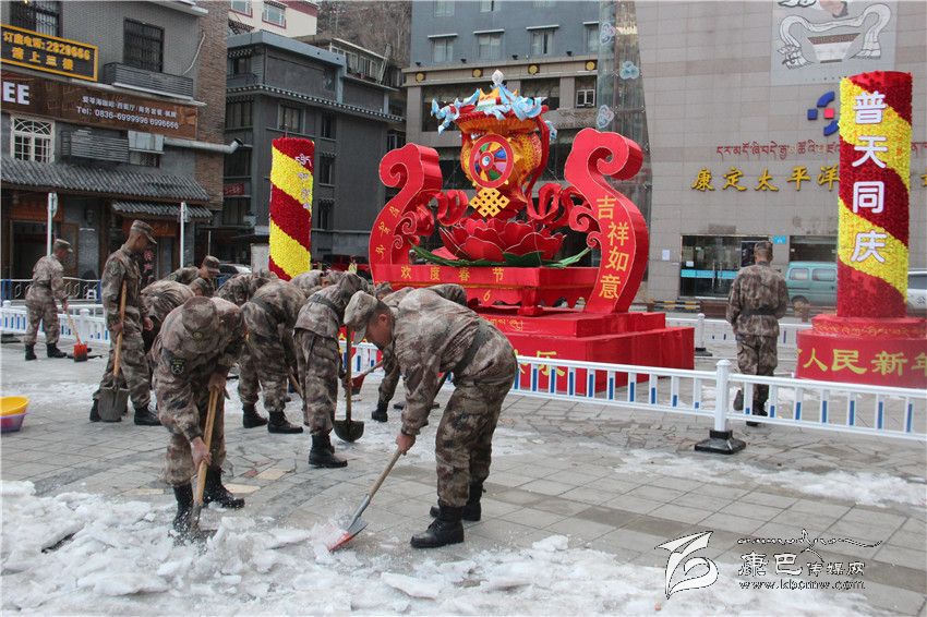 情歌廣場,官兵們鏟除冰雪,除去塵土垃圾,留下一片潔凈美好;福利院里,官兵們?yōu)槔先藵{洗衣物、打掃衛(wèi)生、理發(fā)洗頭,忙得不亦樂乎。幾位女兵還專門為老人們送去了自編自演的節(jié)目,這個“一家人”的溫馨聚會,讓老人們倍感高興、倍感溫暖。而此刻,遠在道孚的分區(qū)部隊某營官兵的愛民助民活動也進行的如火如荼。