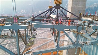 無人機先牽引一根2毫米“韓國絲”(韓國進口的強韌性尼龍繩)布設(shè)兩岸橋塔,然后在2毫米“韓國絲”的“幫襯”下布設(shè)4毫米“韓國絲”,再到6毫米“韓國絲”,又到8毫米“韓國絲”,在這種相互“提攜”下布設(shè)上下各1根32毫米鋼索形成牽引系統(tǒng),用拽拉器布設(shè)錨道,進行兩根主纜施工。主纜直徑達(dá)76厘米,由187股鋼繩組成,每根鋼繩由91根直徑5.3毫米長度1700米的特性鋼絲構(gòu)成,兩根主纜所用鋼絲總長達(dá)60000千米,可繞地球一周半