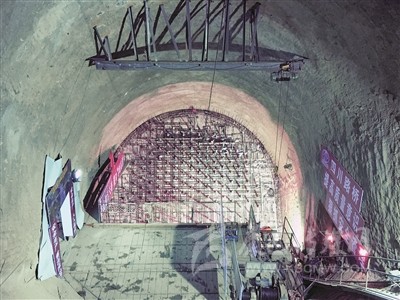 隧道式錨碇建設(shè)運用系列實用型發(fā)明創(chuàng)新,發(fā)掘有利條件,利用瀘定隧道橫洞,采用平移系統(tǒng)安全、高效地轉(zhuǎn)運鋼拉桿;進入隧道錨工作區(qū)域后,在洞內(nèi)安裝纜索吊裝系統(tǒng)進行鋼拉桿安裝,安裝過程中通過人工配合手拉葫蘆進行精確微調(diào),實現(xiàn)了高強度鋼拉桿在狹窄、封閉的錨洞中的轉(zhuǎn)運、安裝和精確定位。