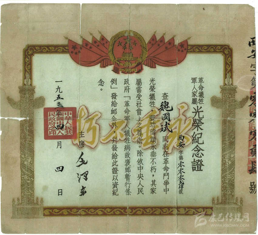 魏國(guó)賓革命犧牲軍人家屬光榮紀(jì)念證。