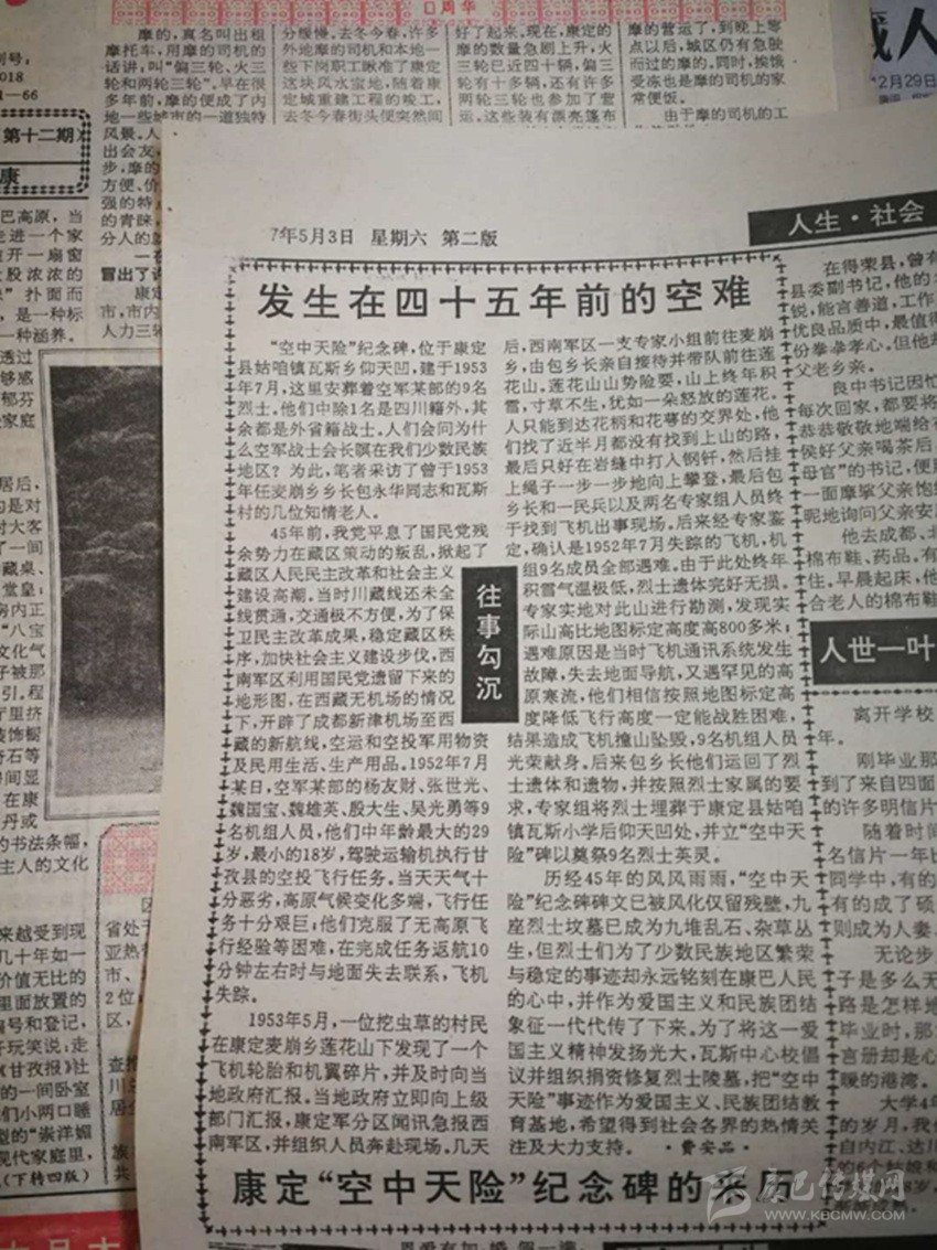 《甘孜日?qǐng)?bào)》1997年5月3日第二版刊登了《發(fā)生在四十五年前的空難——康定“空中天險(xiǎn)”紀(jì)念碑的來歷》一文,詳細(xì)記錄了1952年空軍某部9名人員駕駛運(yùn)輸機(jī)執(zhí)行空投飛行任務(wù),不幸在康定地區(qū)撞山墜毀,英勇犧牲的故事。這9名烈士后被當(dāng)?shù)厝罕姲苍?,建立“空軍墓”和“空中天險(xiǎn)”紀(jì)念碑。 作為烈士犧牲地的甘孜多年來一直在尋找這9名烈士家屬,以圖告慰英靈。但由于線索有限,一直未有結(jié)果。