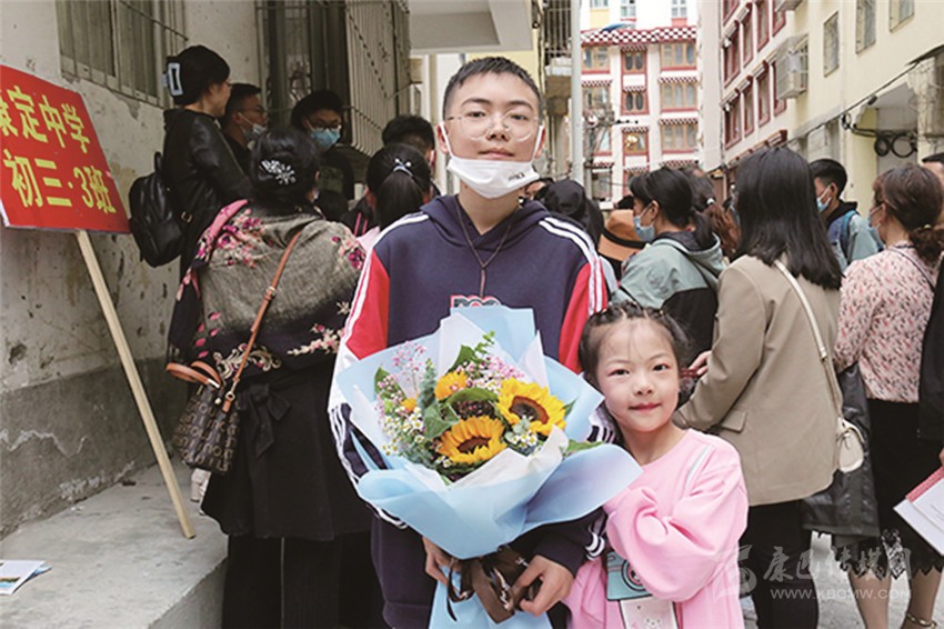 圖為妹妹為參加中考的哥哥獻(xiàn)上鮮花。
