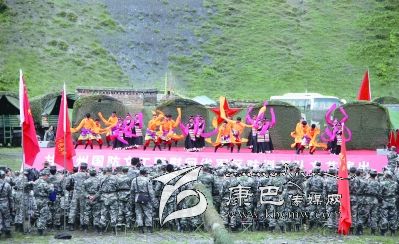 慰問演出在獨(dú)立營戰(zhàn)士的拉歌聲中徐徐拉開帷幕,隨后,《北京的金山上》、《我的士兵兄弟》等一首首耳熟能詳?shù)母枨鹨簧涎?。《歡歌踏舞》、《盛世歡歌》等舞蹈,時(shí)而歡快跳躍,時(shí)而雄壯豪邁,歌曲《說句心里話》唱出了官兵的思念之情,也唱出了官兵們保家衛(wèi)國的心聲。整場演出在舞蹈《康巴人》中落下帷幕。