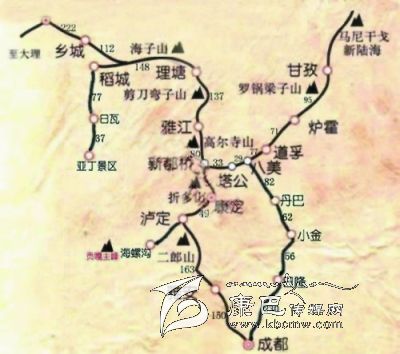 成都—瀘定橋(瀘定)—木格措、跑馬山、康定情歌城(康定)—雅家埂—燕子溝—海螺溝(磨西鎮(zhèn))—安順場(石棉)—雅安—成都
